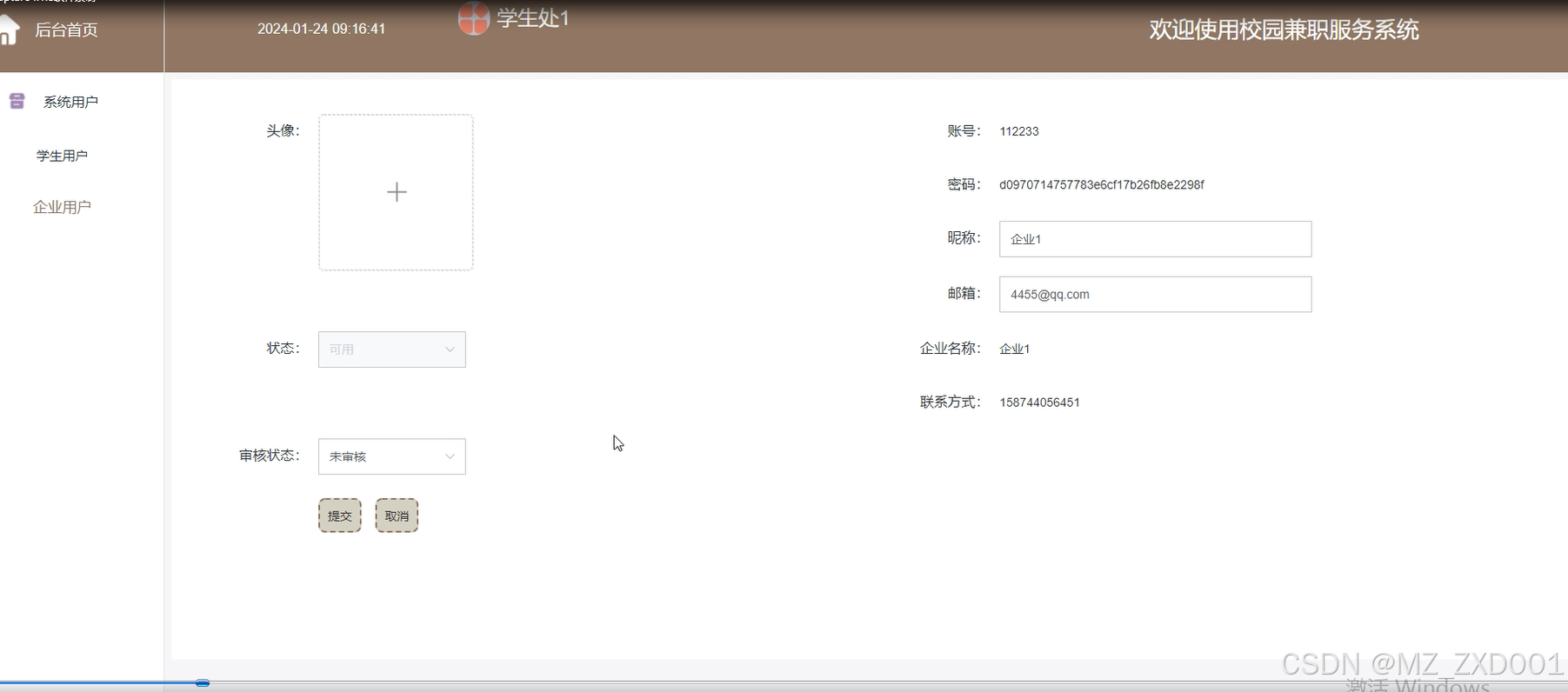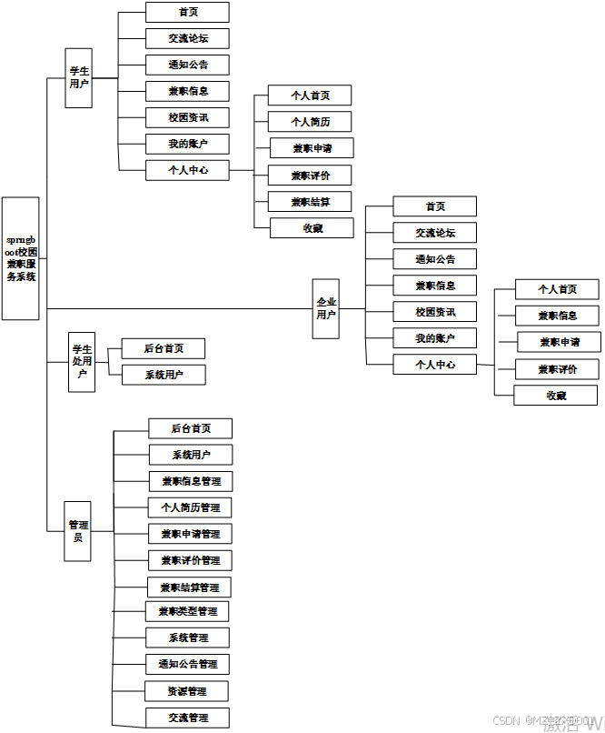 在Spring Boot校园兼职服务系统中,涉及到不同的角色,包括管理员、企业用户、学生用户和学生处用户。下面对这些角色进行简要的分析: