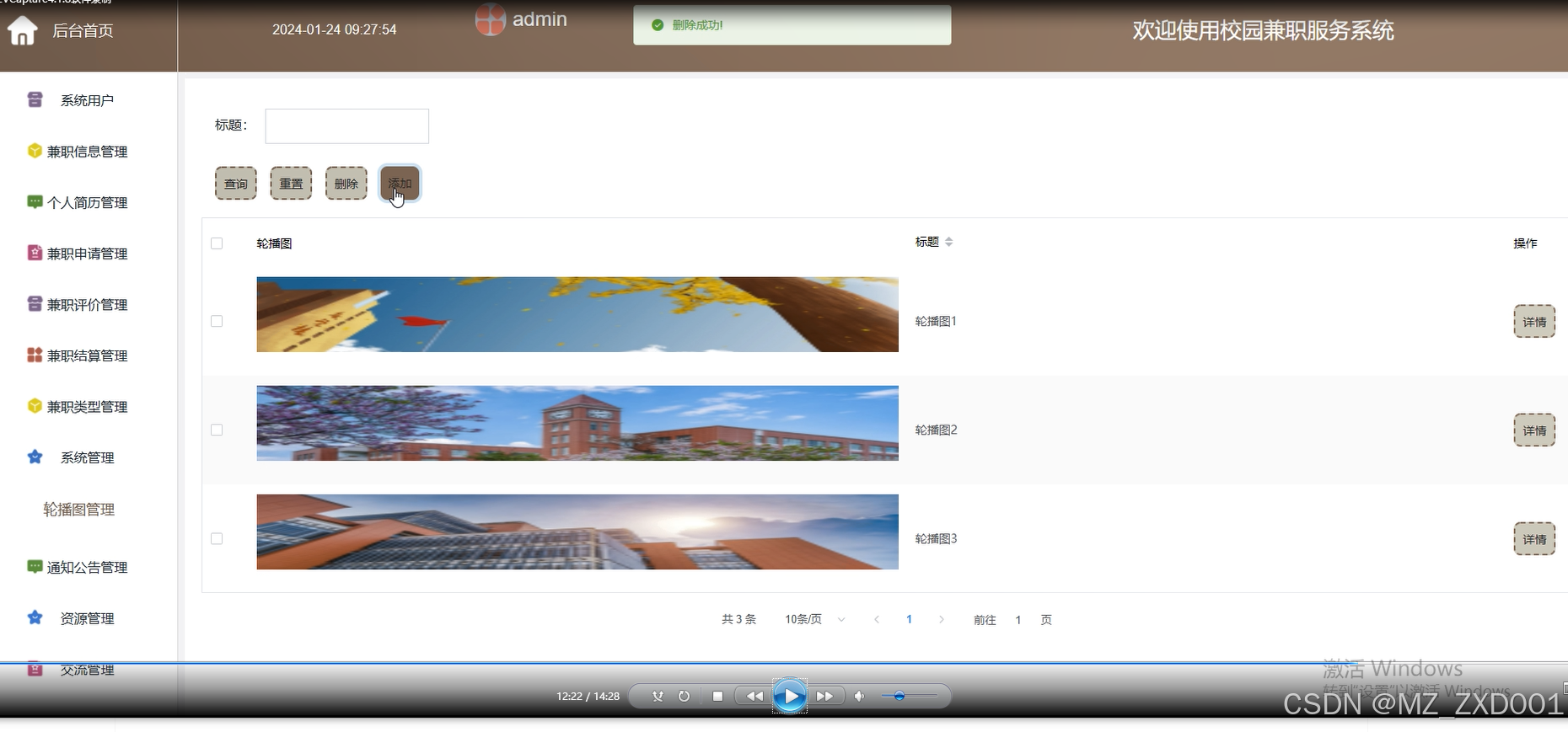 系统管理:管理员可以对系统前台展示的轮播图进行增删改查,方便用户进行查看。系统管理界面如下图所示。