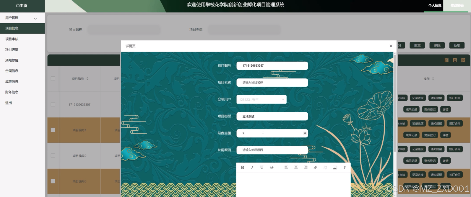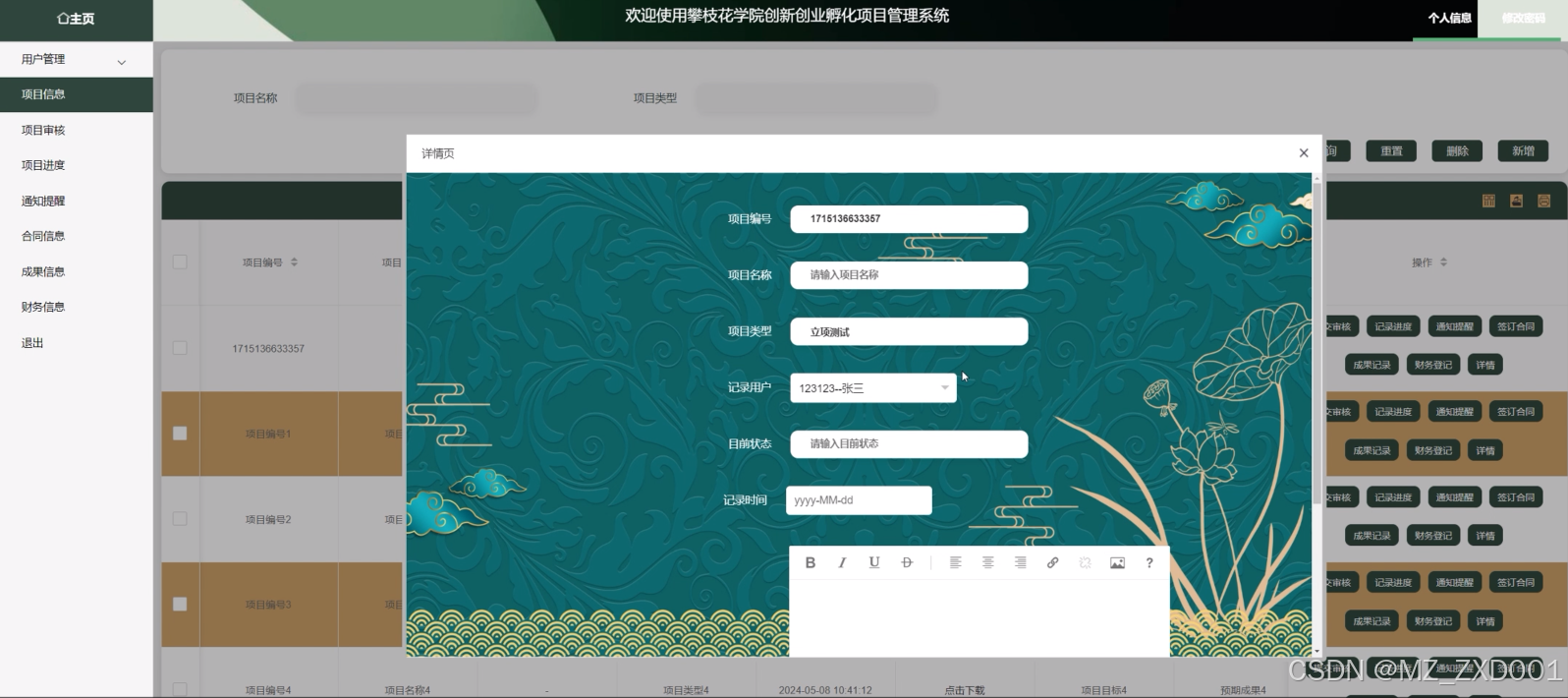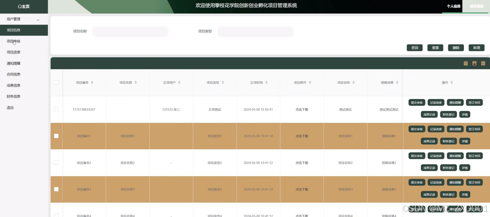 攀枝花学院创新创业孵化项目管理系统为用户提供登录注册、后台首页、项目信息、项目审核、项目进度、通知提醒、合同信息、成果信息、财务信息等功能。教管理员则负责后台首页、用户管理、项目信息管理、项目审核管理、项目进度管理、通知提醒管理、合同信息管理、成果信息管理、财务信息管理等功能。该系统旨在提供高效、安全且易用的攀枝花学院创新创业孵化项目管理体验,满足用户和管理员的需求,优化创新创业孵化项目管理流程,提升创新创业孵化项目质量。具体如下: