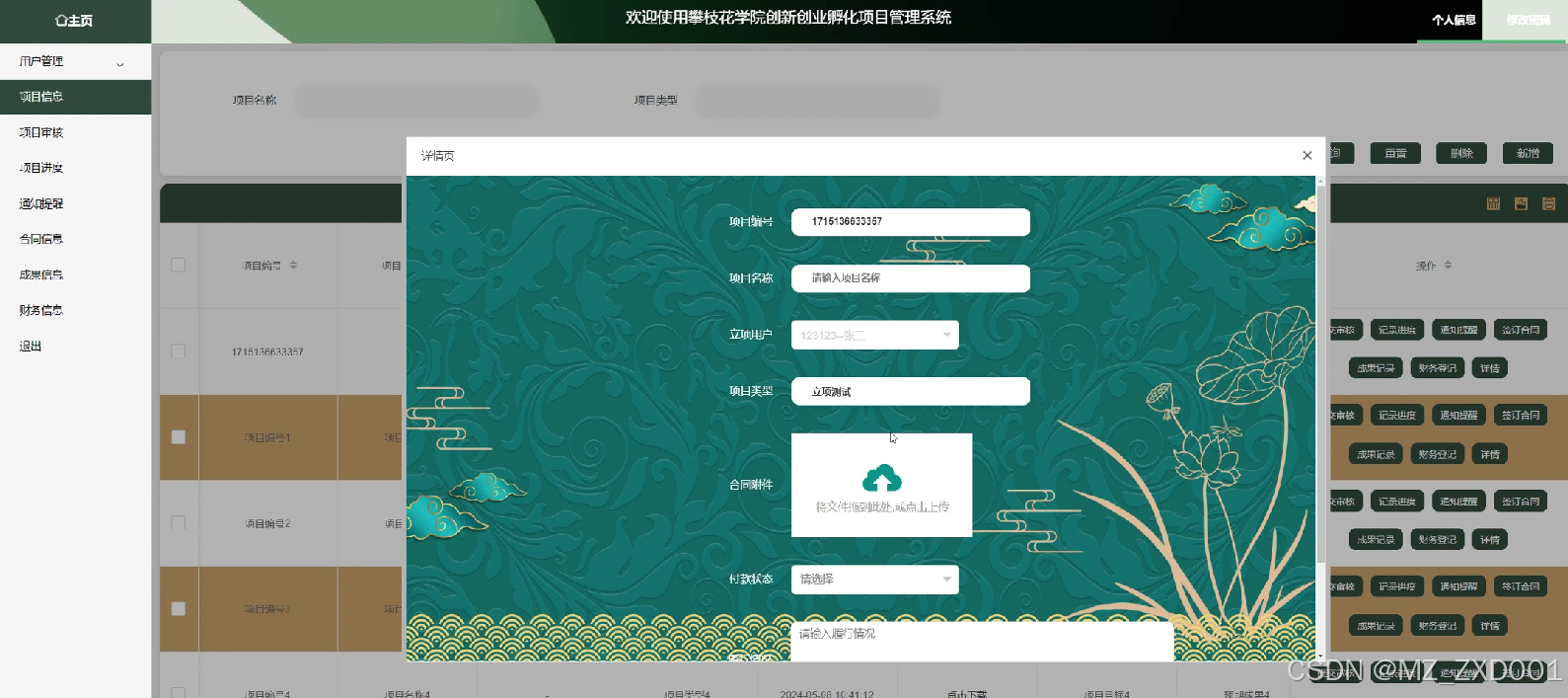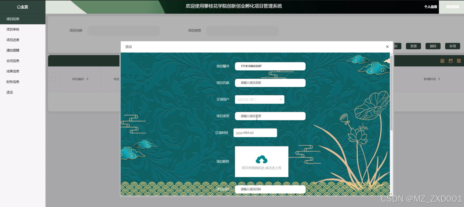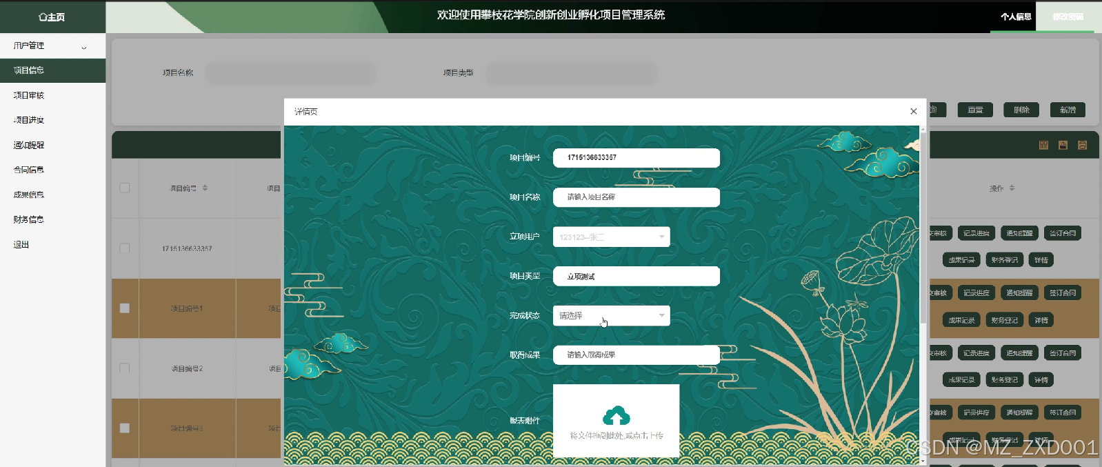 攀枝花学院创新创业孵化项目管理系统为用户提供登录注册、后台首页、项目信息、项目审核、项目进度、通知提醒、合同信息、成果信息、财务信息等功能。教管理员则负责后台首页、用户管理、项目信息管理、项目审核管理、项目进度管理、通知提醒管理、合同信息管理、成果信息管理、财务信息管理等功能。该系统旨在提供高效、安全且易用的攀枝花学院创新创业孵化项目管理体验,满足用户和管理员的需求,优化创新创业孵化项目管理流程,提升创新创业孵化项目质量。具体如下: