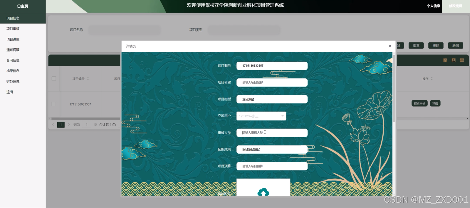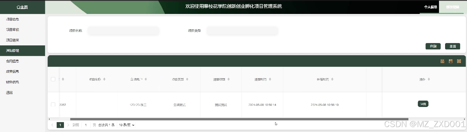 项目信息:项目信息功能是该平台的核心服务之一。用户可以在该功能中创建、管理和查看自己的项目信息。用户可以新增项目,填写项目名称、类型、立项时间等基本信息,并上传项目附件以便后续查看和参考。此外,用户还可以设置项目目标和预期成果,并提交审核以便平台进行审核和管理。项目信息还支持详情查看、查询、重置和删除等操作,方便用户随时管理和更新项目信息,其主界面展示如下图所示。
