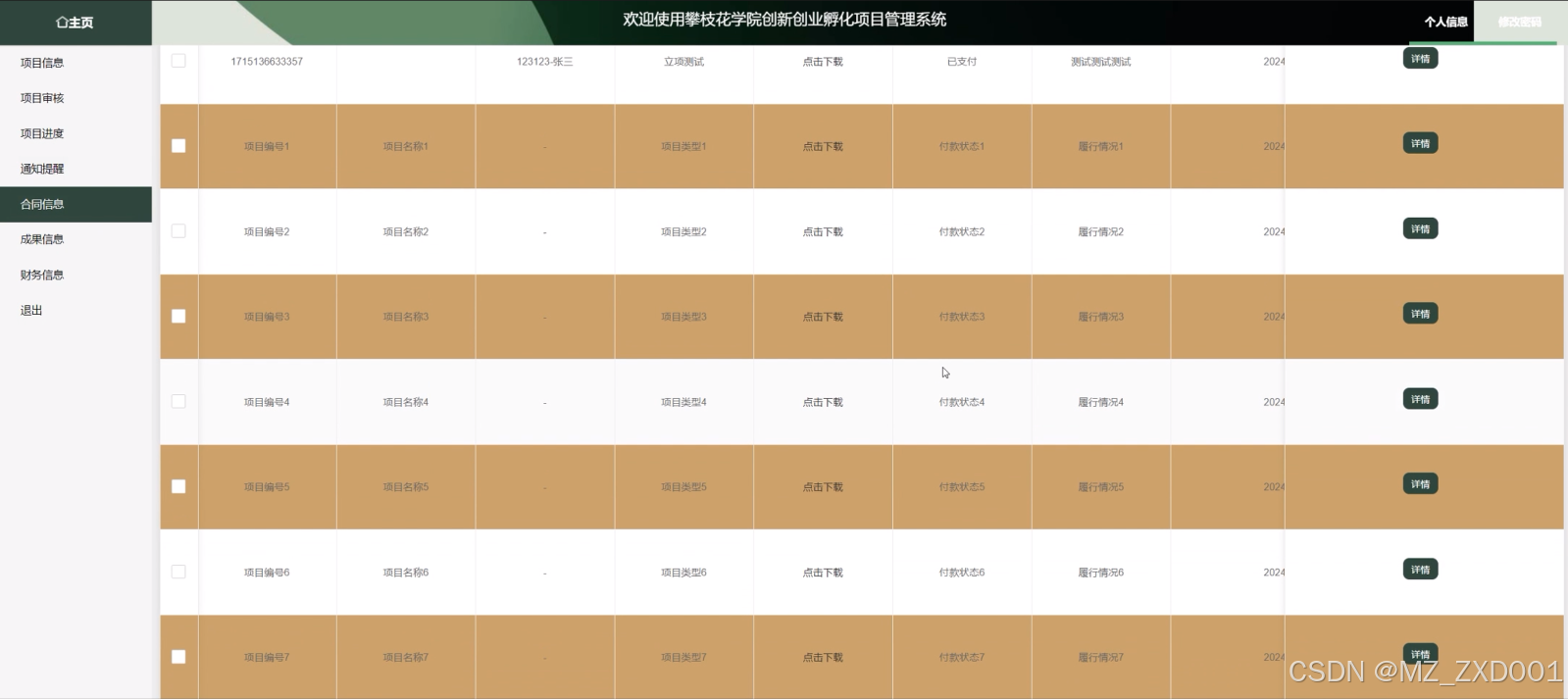 - 项目信息:项目信息功能提供了项目查询、详情查看和删除操作。管理员可以通过项目信息查询功能快速找到特定项目,查看项目的详细信息,包括项目名称、项目描述、项目状态等。同时,管理员还可以通过详情查看功能对项目进行更深入的了解,包括项目名称、项目进度、合同信息等。对于不再需要的项目,管理员可以选择删除。