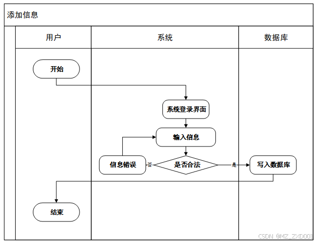 管理员可以对攀枝花学院创新创业孵化项目管理系统中进行信息的添加,用户可以对自己权限内的信息进行添加,输入信息后,系统会自行验证输入的信息和数据,若信息正确,会将其添加到数据库内,若信息有误,则会提示重新输入信息,添加信息流程如图3-6所示。