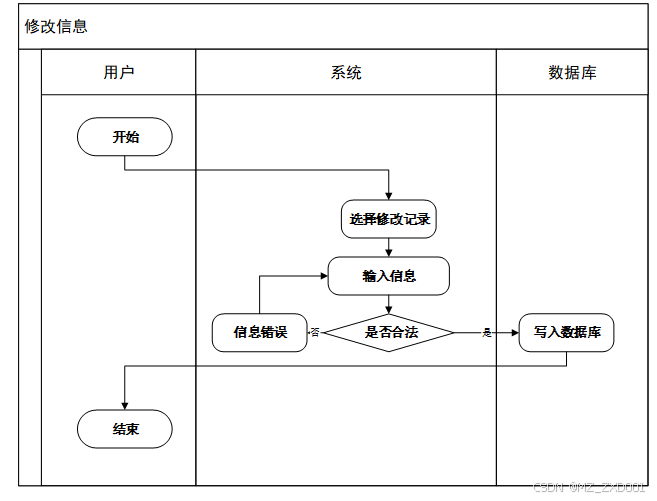 管理员可以对攀枝花学院创新创业孵化项目管理系统中的信息进行修改,用户可以对自己权限内的信息进行修改,首先进入修改信息界面,输入修改信息数据,系统进行数据的判断验证,修改信息合法则修改成功,信息更新至数据库,信息不合法则修改失败,重新输入。修改信息流程图如图3-7所示: