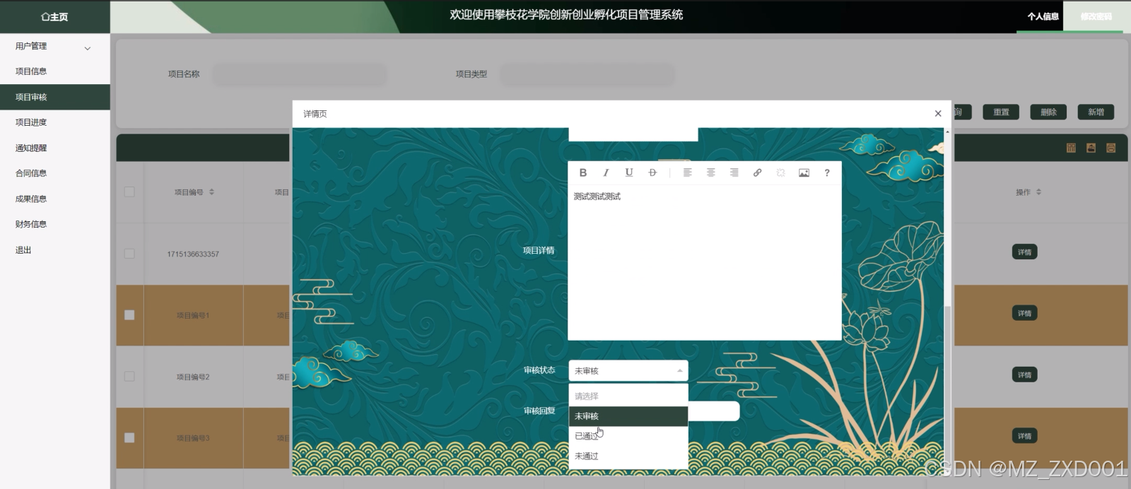 - 项目审核:项目审核功能是该平台对用户提交的项目信息进行审核和管理的服务。审核人员可以通过该功能查看项目的详细信息、上传的资料附件等,并对项目进行审核和评估。审核结果将影响项目是否能够通过审核,项目审核还支持详情查看、查询、重置和删除等操作,方便审核人员管理和维护项目审核流程。