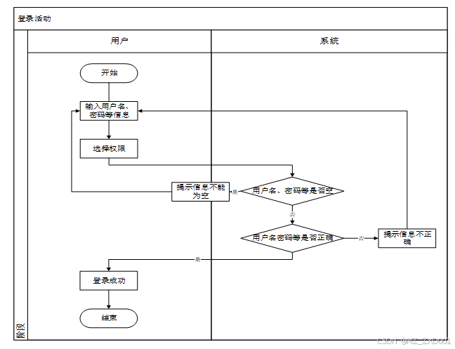 新用户在登录系统时,需要先输入相应的账号密码,系统在数据库中检索相应的用户信息,如果存在该用户在检测输入的密码是否正确,密码正确则登录成功,密码错误则选择进行重新输入,登录流程图如图3-5所示: