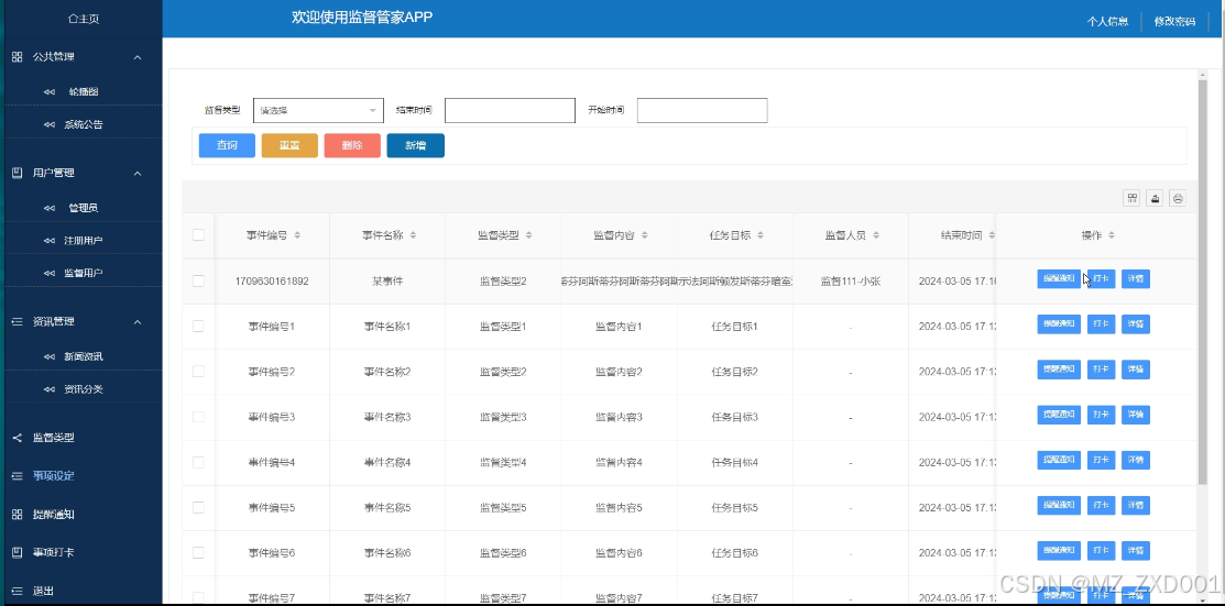 ——事项设定:点击事项设定,可对事项设定进行添加(事件编号、事件名称、监督类型、监督内容、任务目标、监督人员、结束时间、开始时间、登记用户、用户姓名)可点击详情和进行打卡和增删改查操作。