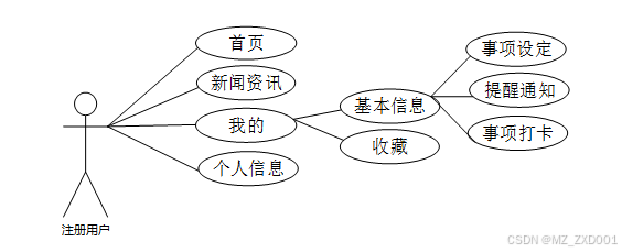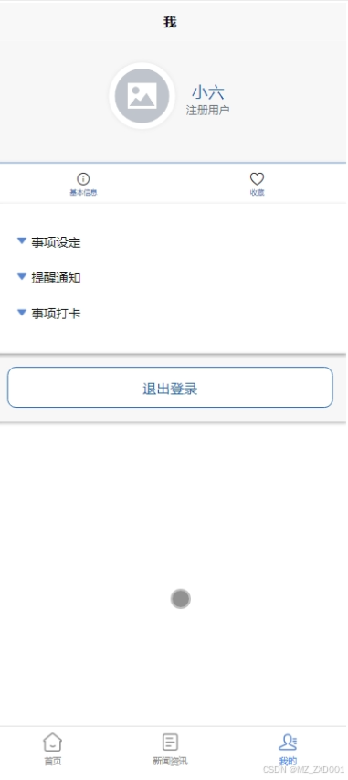 (3)我的:可对基本信息、收藏、退出登录等功能进行管控。基本信息包括事项设定、提醒通知、事项打卡等信息功能。