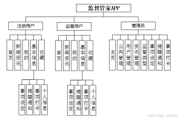 通过对监督管家APP的需求分析,该系统主要分为注册用户、监督用户和管理员三大功能模块,注册用户可以浏览、发布推荐、购买商品等,而管理员则具有更多的后台管理权限,包括用户管理、推荐和内容管理、公共管理等功能,以保障平台的正常运营和用户体验。具体如下: