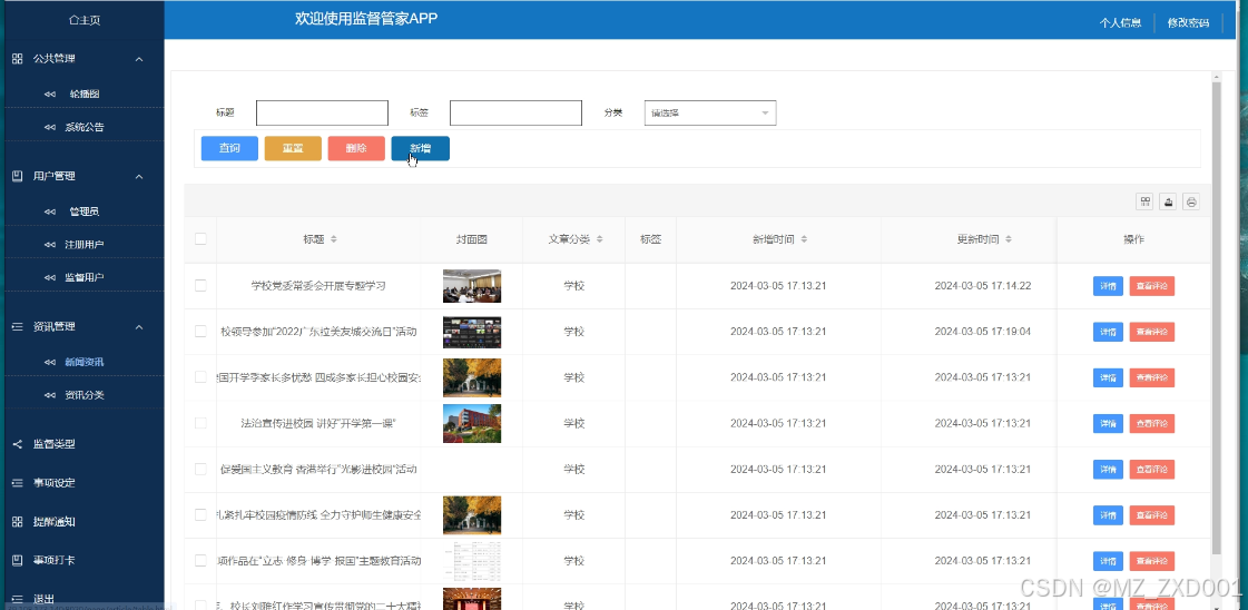 ——提醒通知:可查看详情(事件编号、事件名称、监督类型、监督内容、任务目标、监督人员、结束时间、开始时间、登记用户、用户姓名、提醒内容、审核),可对提醒通知进行审核,并进行增删改查操作。在收藏里查看所收藏的新闻资讯信息,可进行增删改查操作。