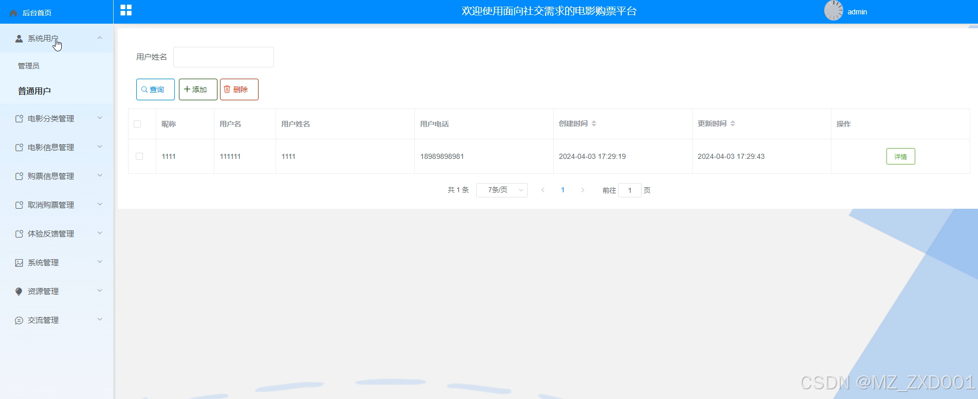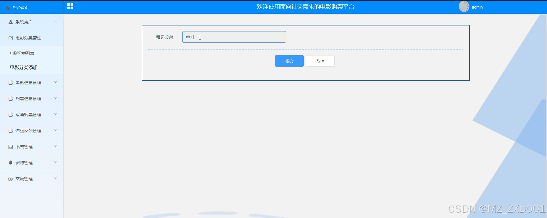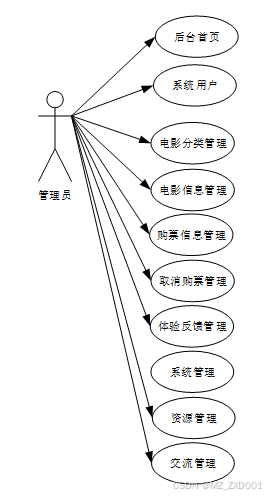 管理员模块功能有:系统用户、电影分类管理、电影信息管理、购票信息管理、取消购票信息管理、体验反馈管理、系统管理、资源管理、交流管理。