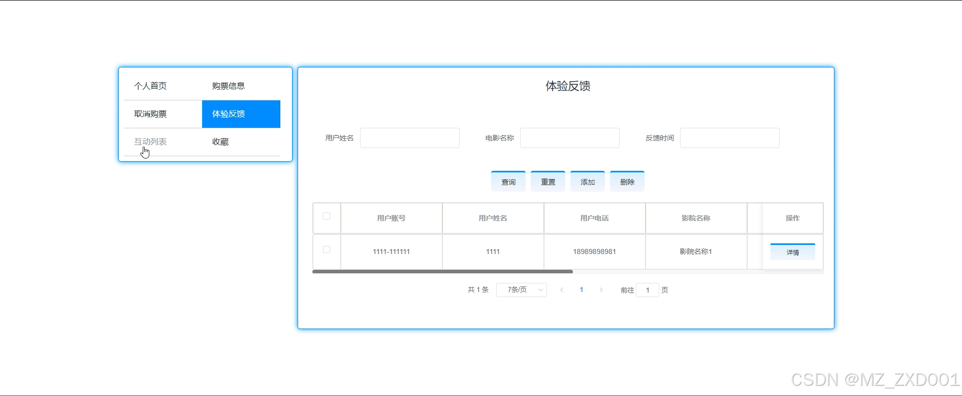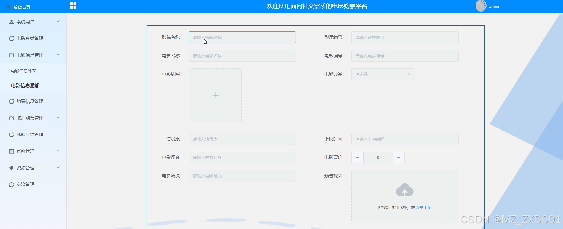 The main function modules of the movie ticket purchase platform for social demand include system users, movie classification management, movie information management, ticket information management, cancellation of ticket information management, experience feedback management, system management, resource management and communication management. The system adopts the development mode of the object for software development and hardware erection, can well meet the actual requirements, improve the corresponding software erection and program coding, take Mysql as the main storage unit of background data, using Vue-Router and Vuex to achieve dynamic routing and global state management, realize all the functions of the system.