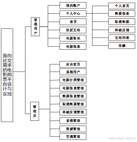 根据用户对系统的需求,要求系统简单操作,能够准确,完整的对信息进行管理。面向社交需求的电影购票平台在对需求做解析后,整个系统主要分为两个部分:管理员和普通用户。每个模块下的分支功能不一样。对功能做出如下说明: