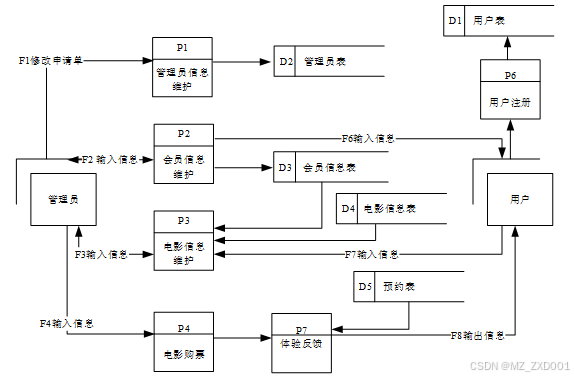 系统底层数据流:外部实体为管理员和普通用户,数据流分别有管理员和普通用户流向系统数据流程,数据表提供数据支持,来完成逻辑操作。