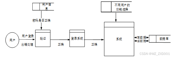 系统顶层数据流:外部实体为用户,第一个流程为登录验证,用户信息表返回密码验证,是否正确,正确则登录系统,错误则反馈信息,登录系统后,根据不同用户的功能选择,来读写数据库。