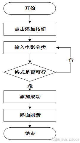 电影分类管理包括电影分类列表等,以电影分类新增为例,在视图层请求电影分类信息新增,反馈后,调用业务逻辑层,通过业务逻辑层的接口调用底层的数据逻辑层完成数据库联动操作。