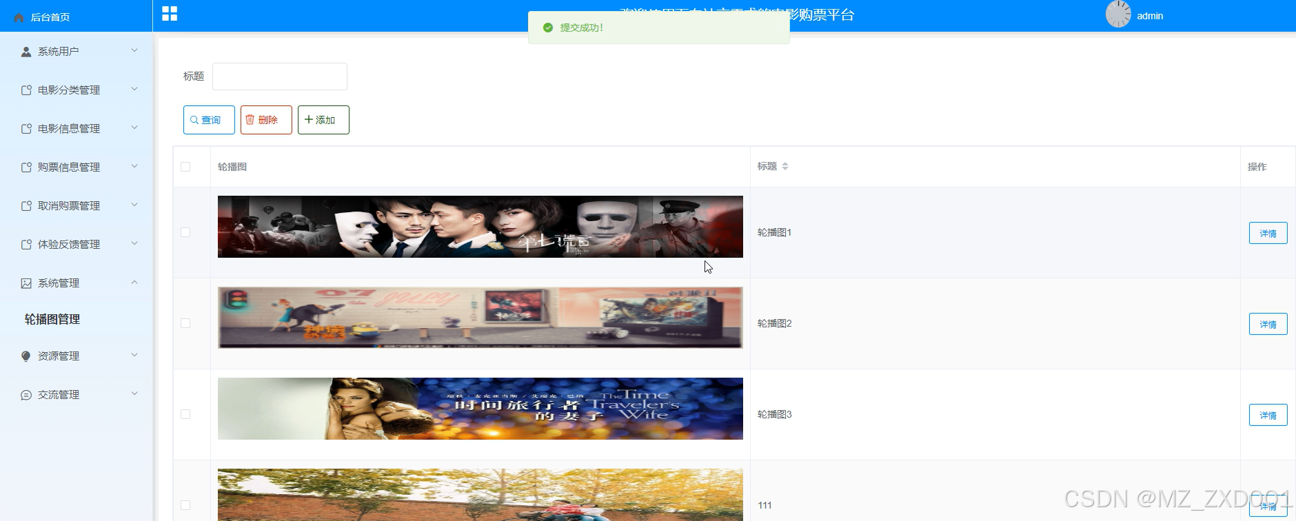 管理员可以对系统前台展示的轮播图进行增删改查,方便用户进行查看。系统管理界面如下图所示。