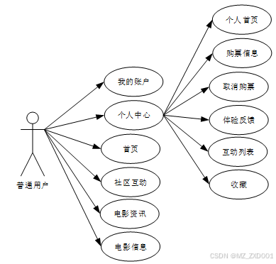 普通用户模块功能有:我的账户、个人中心(个人首页、购票信息、取消购票、体验反馈、互动列表、收藏)、首页、社区互动、电影资讯、电影信息。