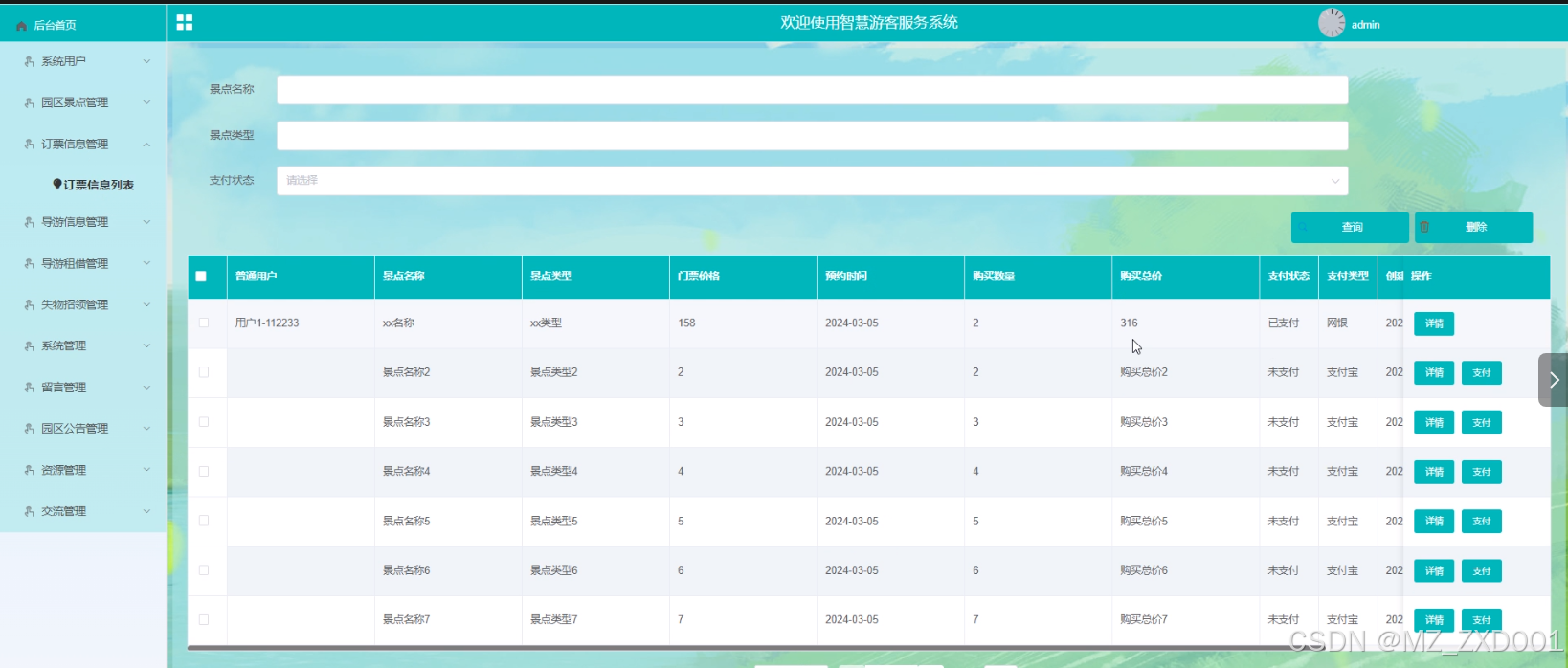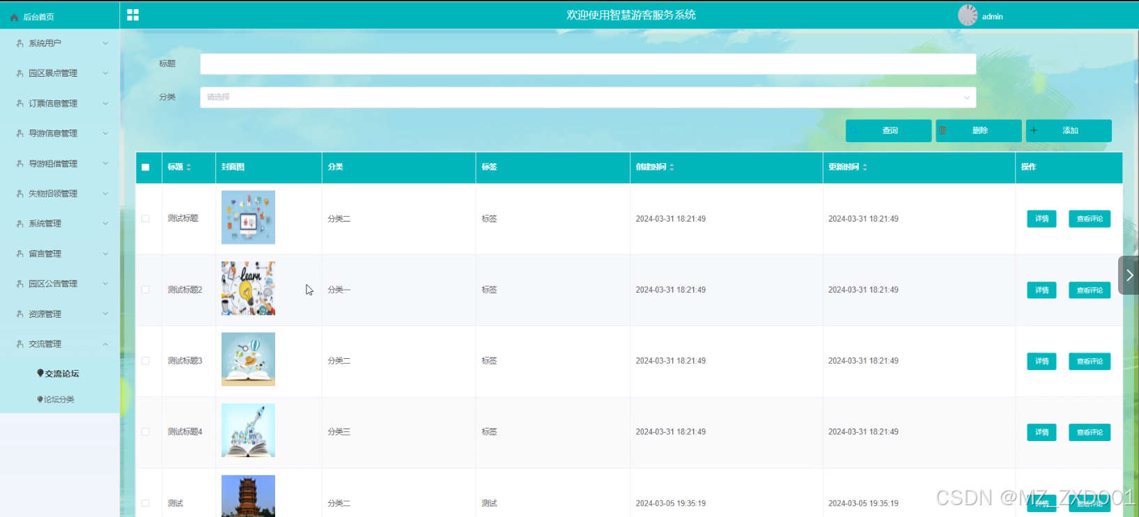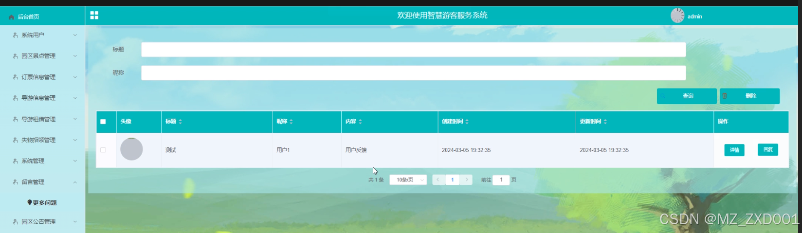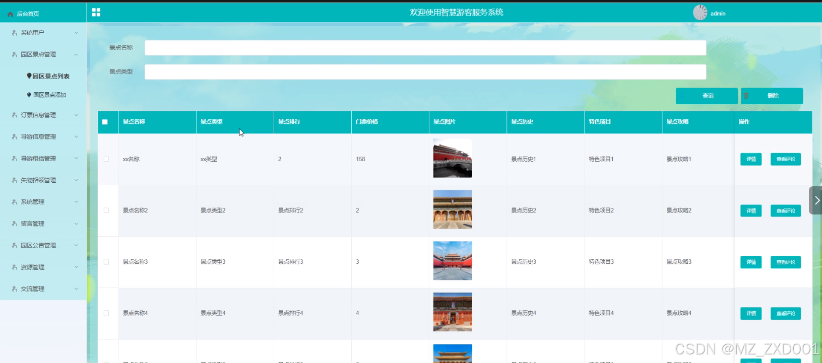 - 园区景点管理:管理员可以查看园区景点列表中的某个景点的详情和评论信息,可以对景点信息进行查询、删除和添加。