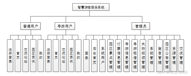 智慧游客服务系统的设计与实现我划分为了普通用户、导游用户和管理员模块这三大部分。