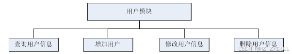 用户模块是系统中一个重要的功能模块,它涉及用户的注册、登录、个人信息管理等操作。在用户模块设计中,我们将定义用户数据的结构和属性,包括用户名、密码、邮箱等。同时,还需要实现用户注册、登录、修改密码等功能,并对用户输入进行验证和处理。用户模块的结构图如下图所示。如下图: