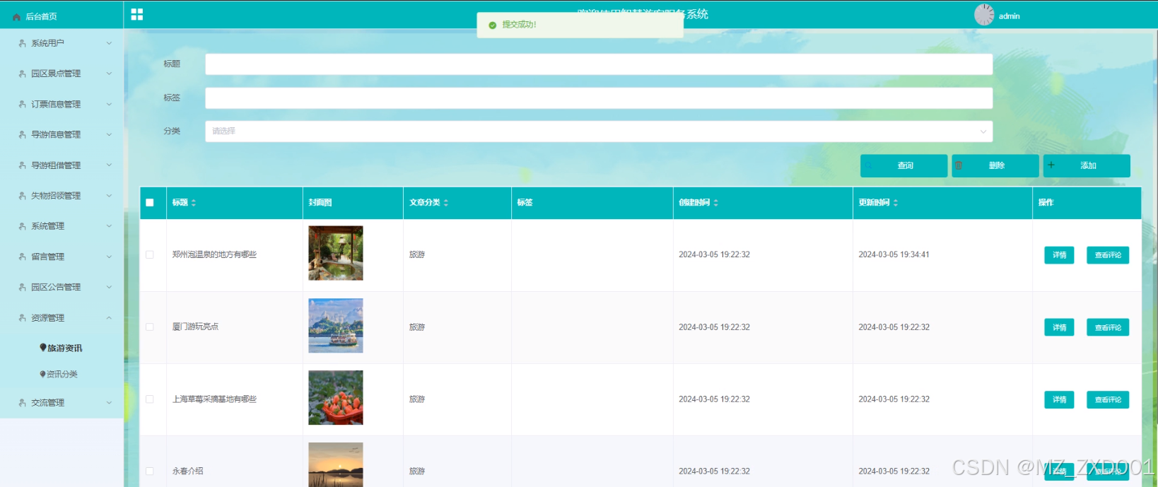 - 资源管理:管理员可以查看旅游资讯列表中某个资讯的详情和评论信息,可以对旅游资讯信息进行查询、添加和重删除操作。可以查看资讯分类列表中某个分类的详情,可以对资讯分类信息进行查询、添加和重删除操作。