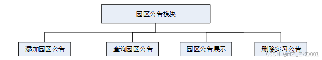 园区公告管理模块是本智慧游客服务系统中的重要功能之一。该模块的设计旨在提供对园区公告信息的发布、编辑、删除和查看等管理功能,以便及时、准确地向用户发布实习相关的重要通知和信息。其模块功能结构,具体的结构图如下: