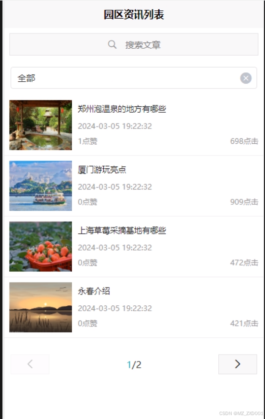 用户点击首页正下方的“园区资讯”进入页面可以查看管理员发布的咨询列表信息,点击列表中的某个资讯可以查看该资讯的详细并可以进行点赞、收藏和评论。园区资讯界面如下图4-4所示。