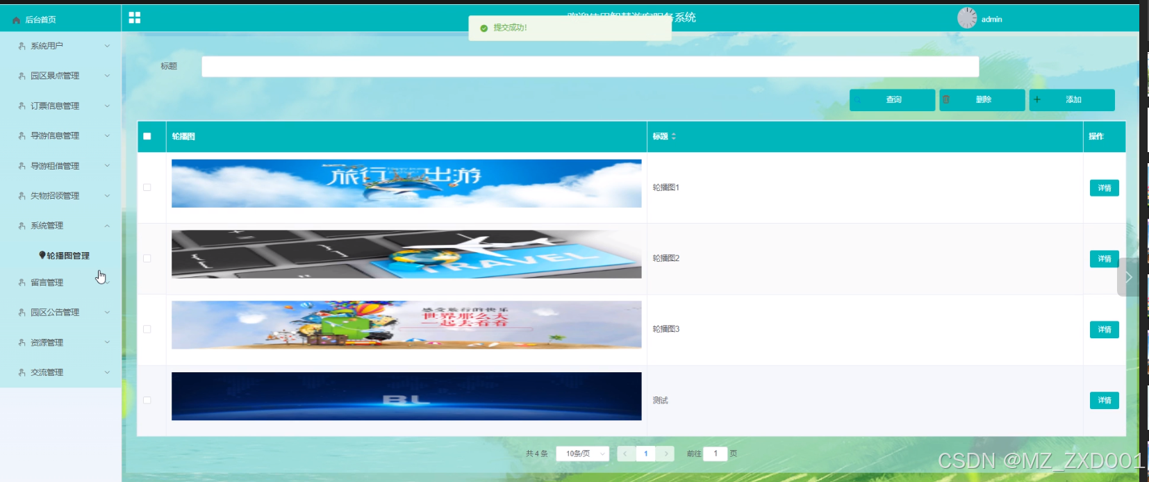 - 系统管理:管理人员在系统管理这一菜单下对轮播图进行管控,可以对轮播图信息进行查询、添加和删除操作。
