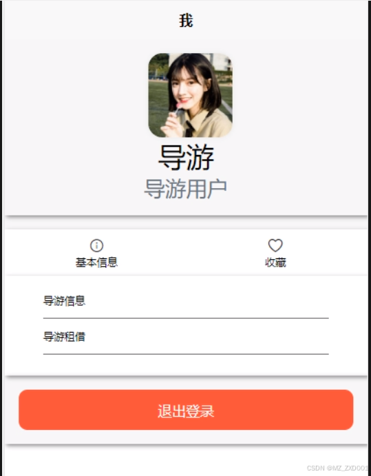用户点击首页正下方的“我的”进入页面可以查看和管理基本信息、收藏、导游信息、导游租赁信息。点击“基本信息”进入页面可以修改个人信息和登录密码;点击“导游信息”进入页面可以查看导游信息列表中某个导游的详情并可以点赞、收藏和评论,可以对导游信息进行添加、重置和删除;点击“导游租赁”进入页面可以查看某个租赁订单的详情可以对导游租赁进行查询和重置;点击“收藏”可以查看或删除收藏列表信息。我的界面如下图4-7所示。
