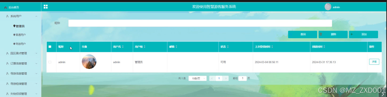 - 系统用户:管理员可以对系统用户(管理员、普通用户、导游用户)信息进行查询、添加和删除操作。