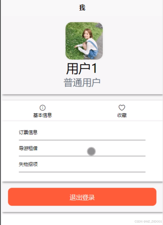 用户点击首页正下方的“我的”进入页面可以查看和管理基本信息、收藏、订票信息、导游租赁、失物招领信息。点击“基本信息”进入页面可以修改个人信息和登录密码;点击“订票信息”进入页面可以查看订票信息列表中某个订单的详情并可以进行在线支付,可以对订票信息进行查询、重置和删除;点击“导游租赁”进入页面可以查看某个租赁订单的详情并进行支付,可以对导游租赁进行查询、重置和删除;点击“失物招领”进入页面可以添加失物信息并提交,可以对失物信息进行查询和重置;点击“收藏”可以查看或删除收藏列表信息。我的界面如下图4-6所示。