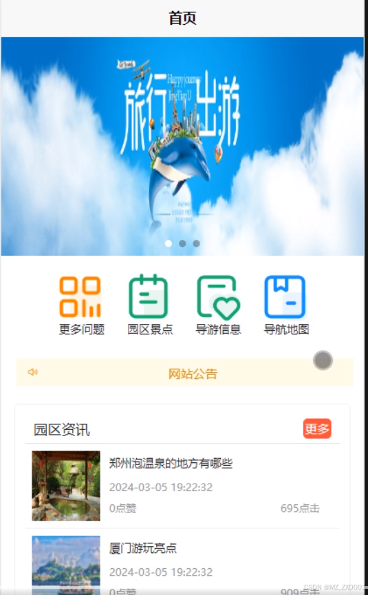 - 首页:用户可以查看首页展示的轮播图、园区资讯、园区景点、导游信息、导航地图等信息。