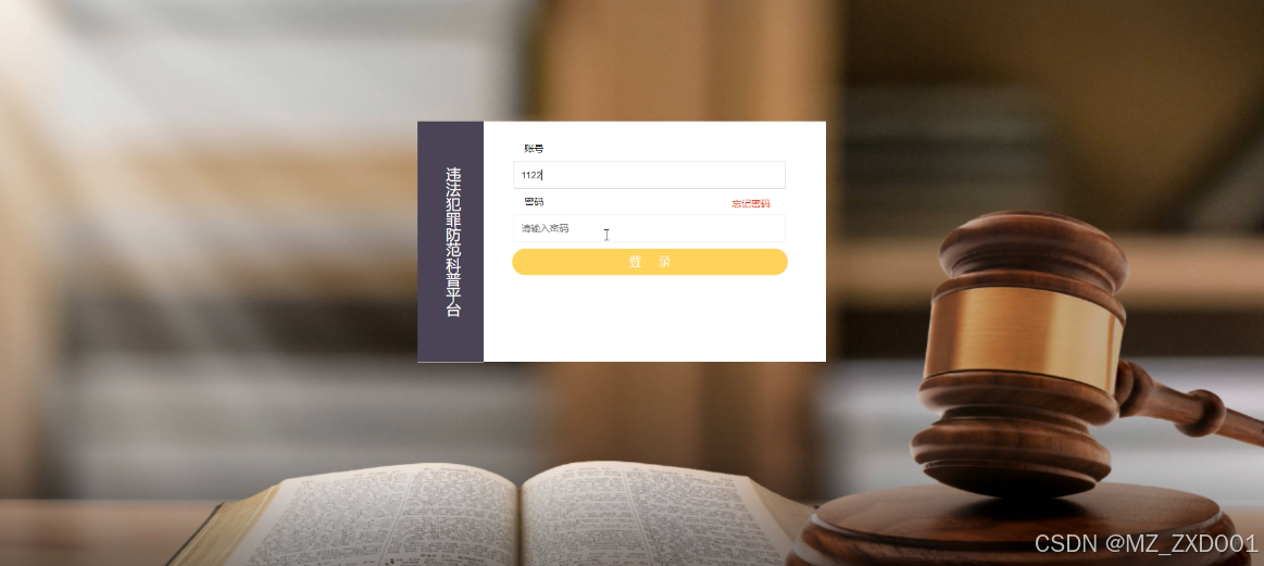 基于Python的违法犯罪防范科普平台设计与实现中,登录模块的实现是指让用户通过输入正确的用户名和密码来登录系统,以便访问和违法犯罪相关的功能。通俗易懂地说,就像我们登录社交媒体或电子邮件账号一样,用户在这个系统中输入他们注册的用户名和密码,然后系统会验证这些凭证是否正确。如果凭证正确,用户就可以进入系统,查看犯罪信息;如果凭证错误,系统将拒绝用户的访问请求,并提示用户重新输入正确的凭证。通过这个登录模块,系统可以确保只有经过授权的用户才能使用违法犯罪防范科普平台,并且保护数据的安全性。