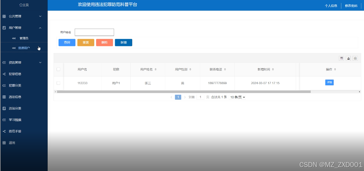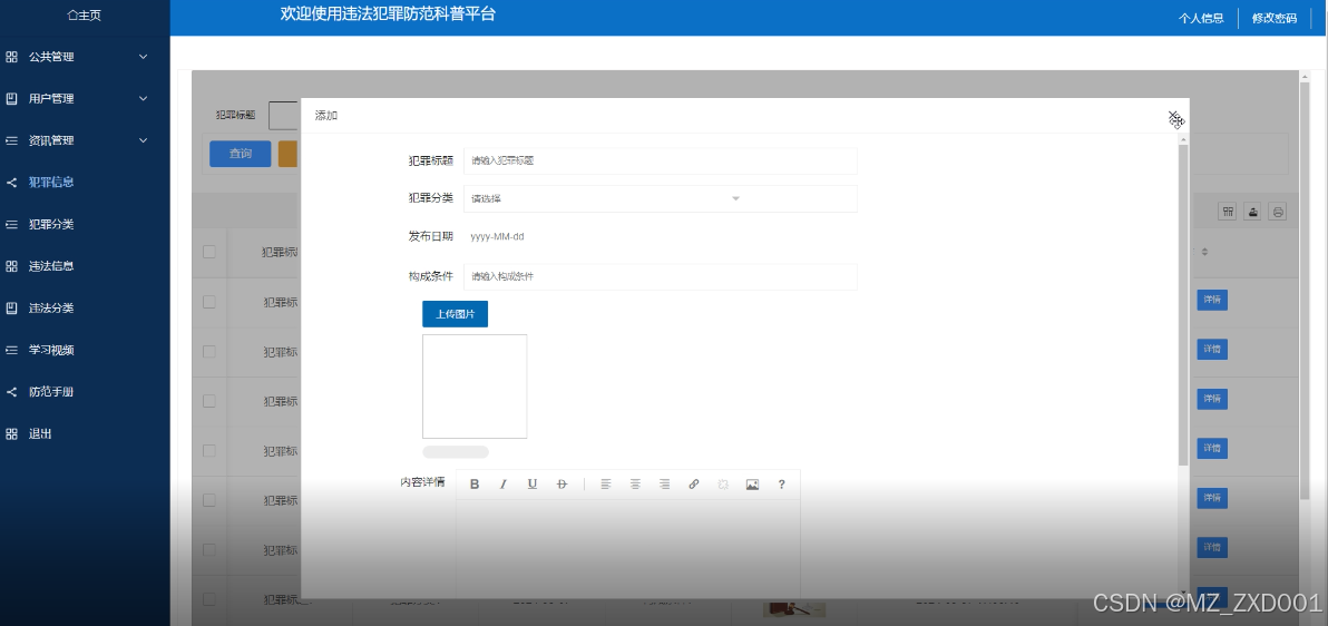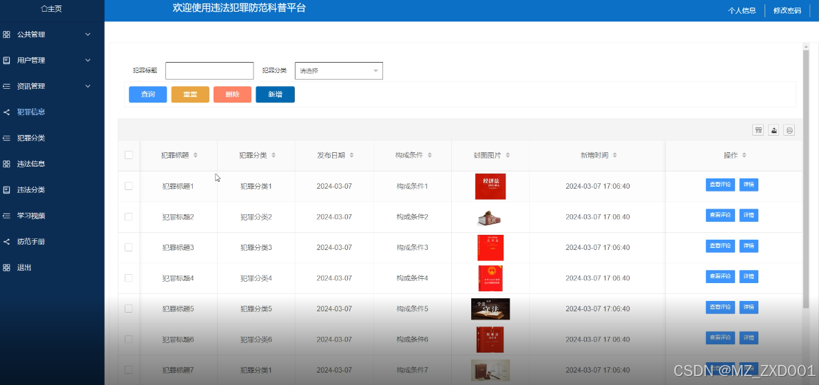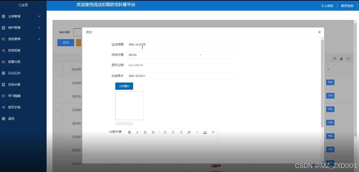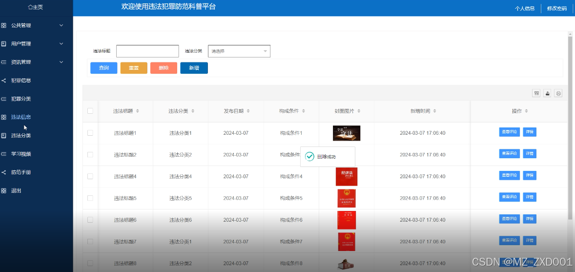 违法信息管理模块的实现是指在违法犯罪防范科普平台中,提供一个功能来维护违法犯罪的信息。通过该模块,可查询、删除和新增违法犯罪信息。