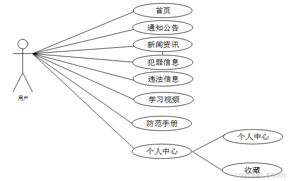 根据以上功能需求,得出以下用例图,用户用例图如下所示。