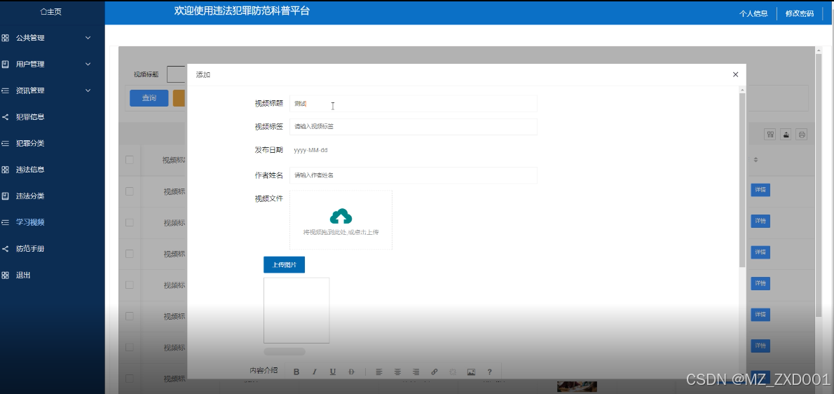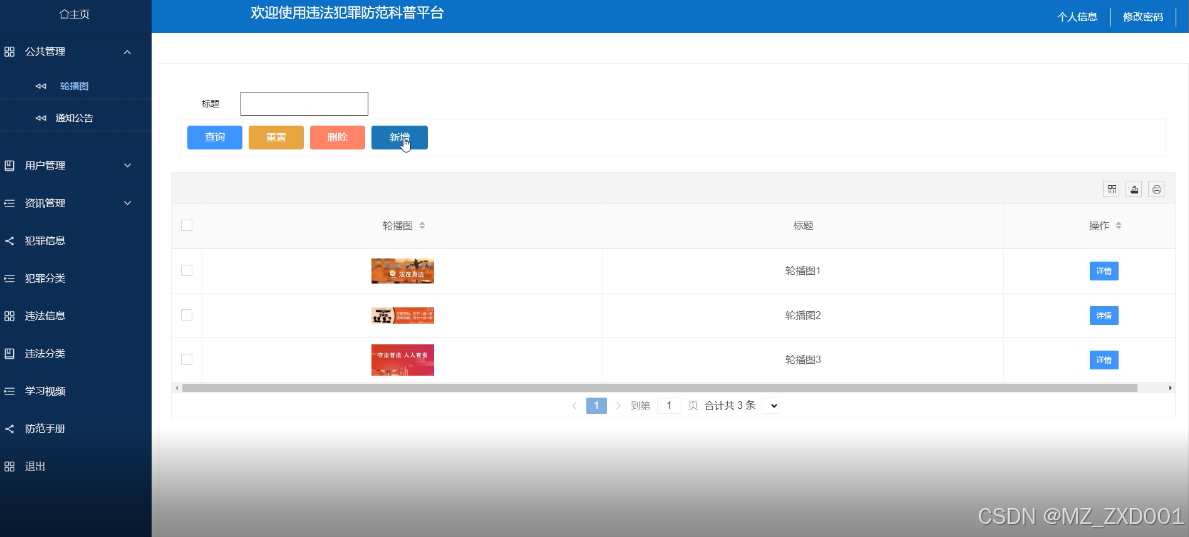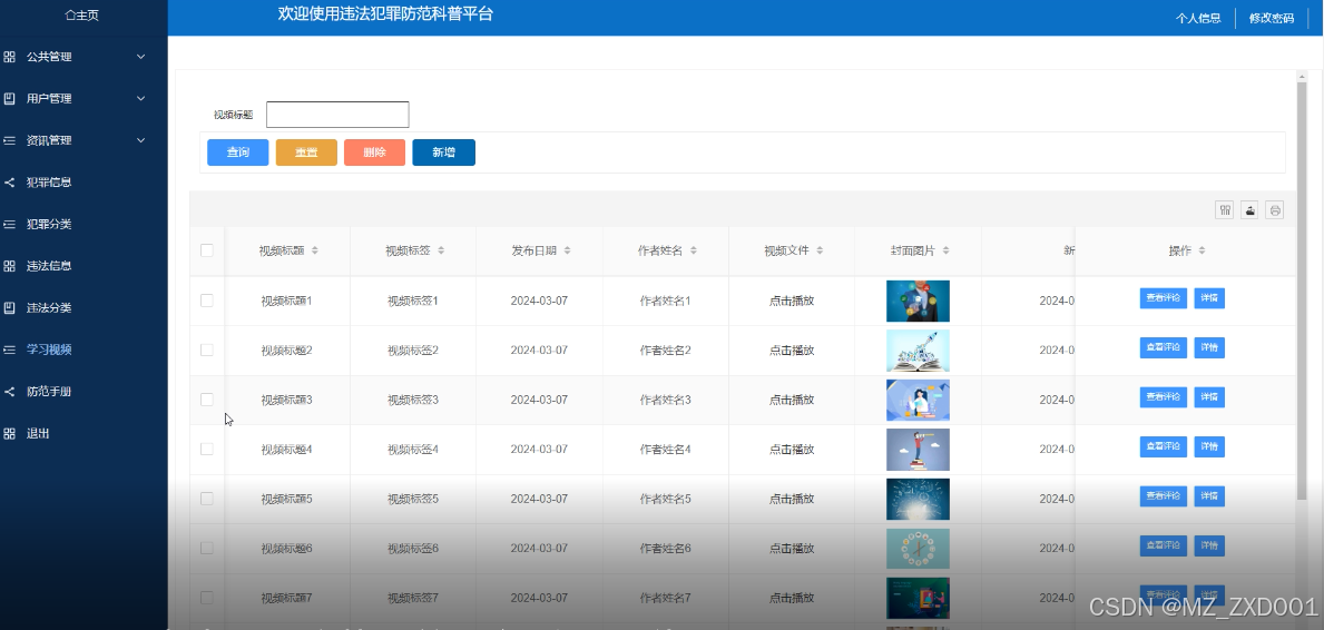 学习视频管理界面是违法犯罪防范科普平台中的一个功能区域,用于方便管理员管理系统中的各种学习资源。通过学习视频管理界面,可以查询、删除和新增学习视频,同时也提供了搜索功能,以便快速定位所需的学习视频。学习视频管理界面如下图所示。