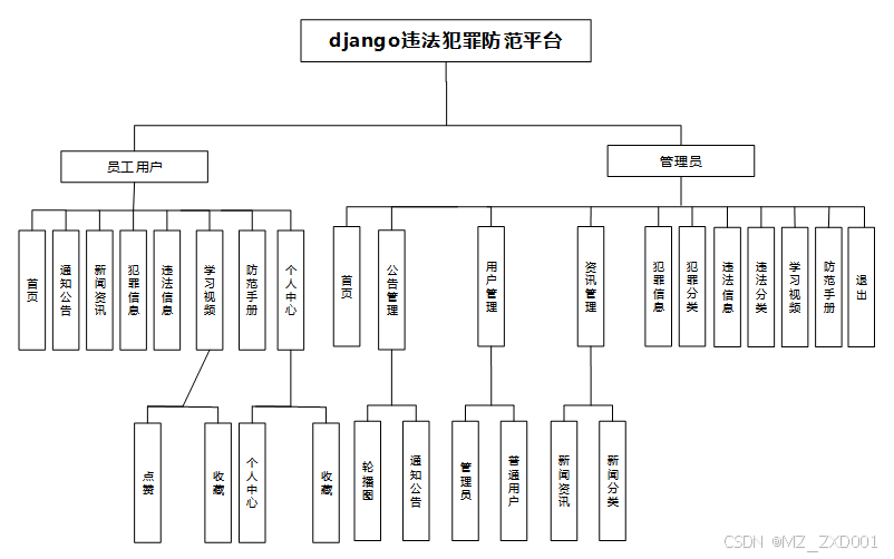 违法犯罪防范科普平台模块的实现是指在违法犯罪防范科普平台中,提供一个功能来管理和展示违法犯罪相关的信息。用户可以通过该模块查看通知公告、新闻资讯、犯罪信息、违法信息等详细信息,并进行评论、点赞和收藏操作。违法犯罪防范科普平台流程如下图所示。