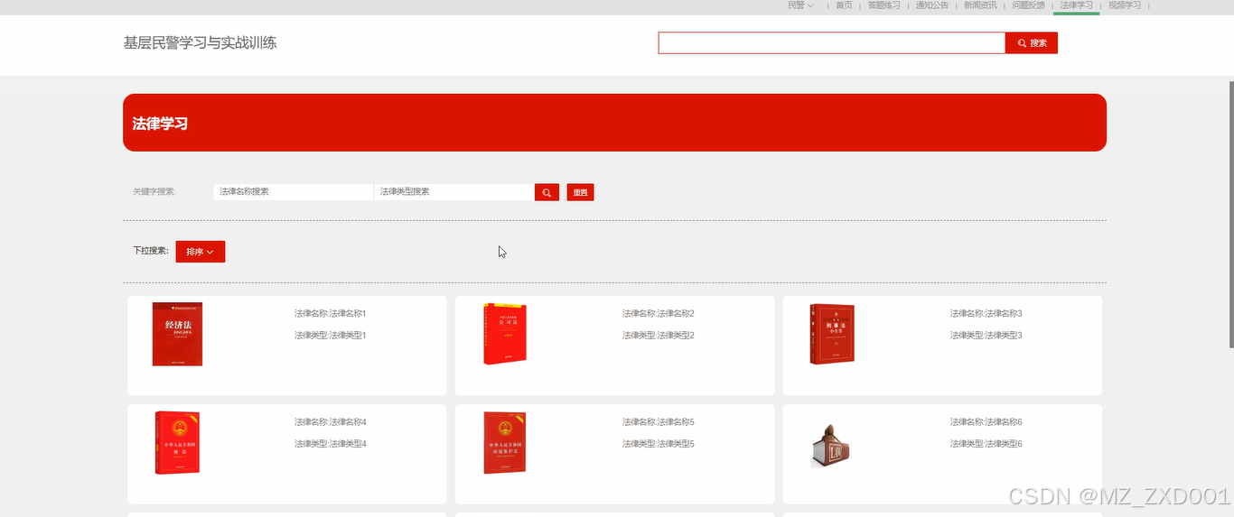 法律学习:用户点击可通过搜索法律名称和法律类型可查看法律学习,同时可对法律知识进行点赞、收藏和评论。