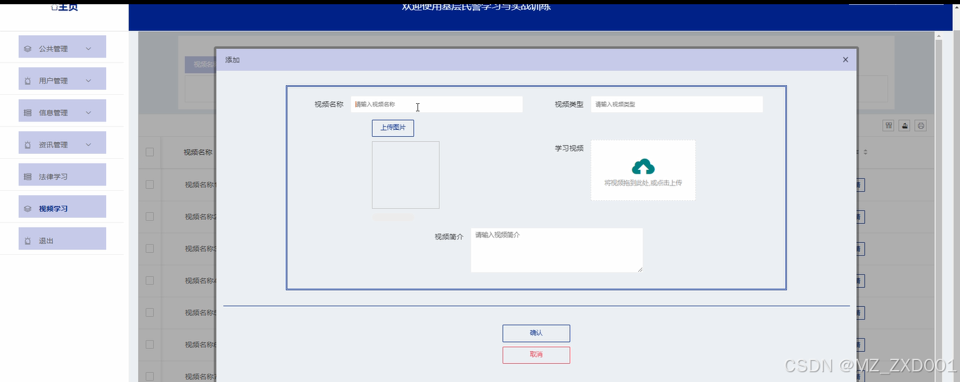 视频学习:管理员点击可查看视频学习列表;点击“新增”按钮,输入视频名称、视频类型。上传图片和学习视频,输入视频简介,点击“确认”按钮进行添加新的视频学习资料。如下图所示。
