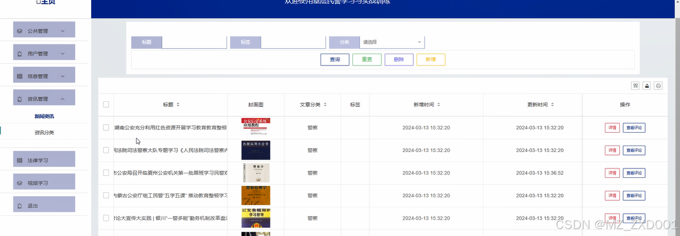 咨讯管理:管理员点击可查看新闻咨讯和咨讯分类;如需添加新的新闻资讯,点击“新增”按钮,上传封面图,输入标题,选择分类,输入标签、描述和正文,点击“确认”按钮进行添加。同时可对咨讯进行增删改查。如下图所示。