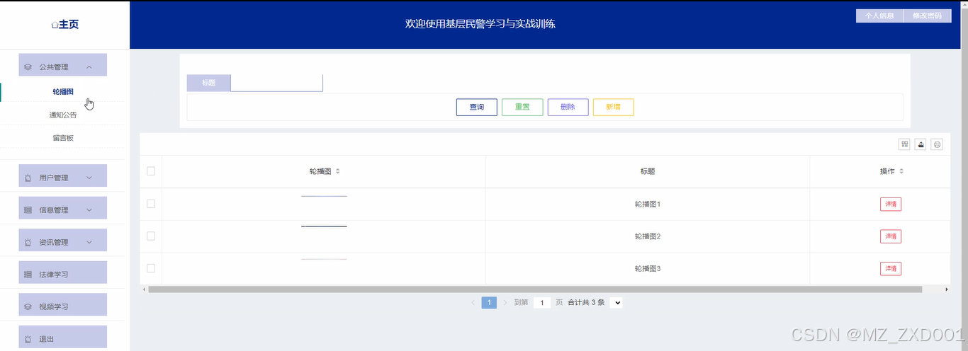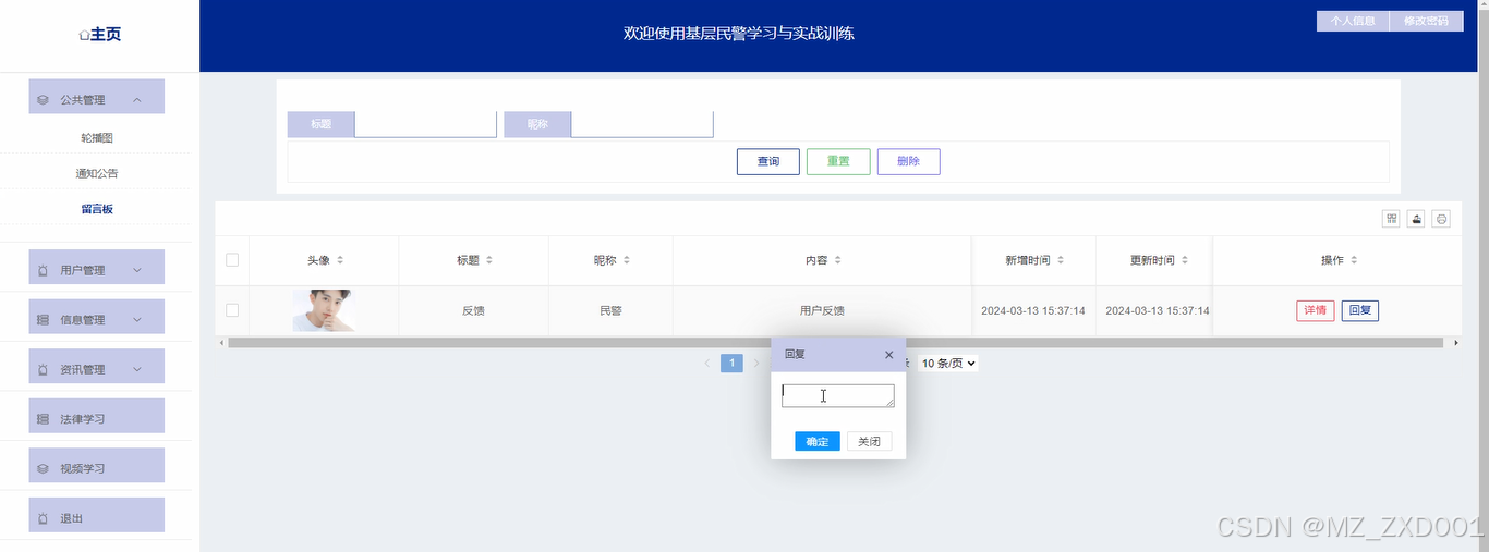 公共管理:管理员点击可查看轮播图、通知公告和留言板;如需添加新的轮播图,点击右侧“新增”按钮,上传图片,输入标题,点击“确认”按钮进行添加;如需添加新的通知公告,点击右侧“新增”按钮,输入标题和正文,点击“确认”按钮进行添加。同时可对用户留言进行回复操作。界面展示如下图所示。