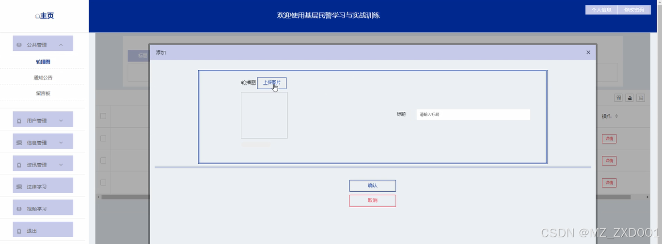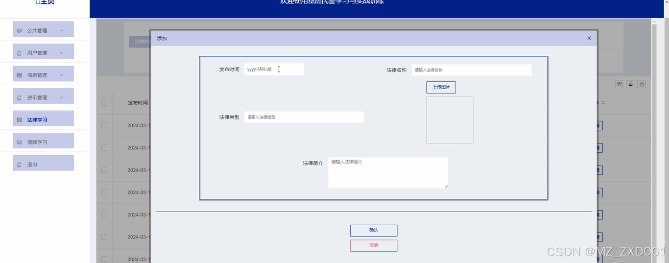 法律学习:管理员点击可查看法律学习列表,点击“新增”按钮,输入发布时间、法律名称、法律类型,上传图片和输入法律简介,点击“确认”按钮添加新的法律学习知识。如下图所示。