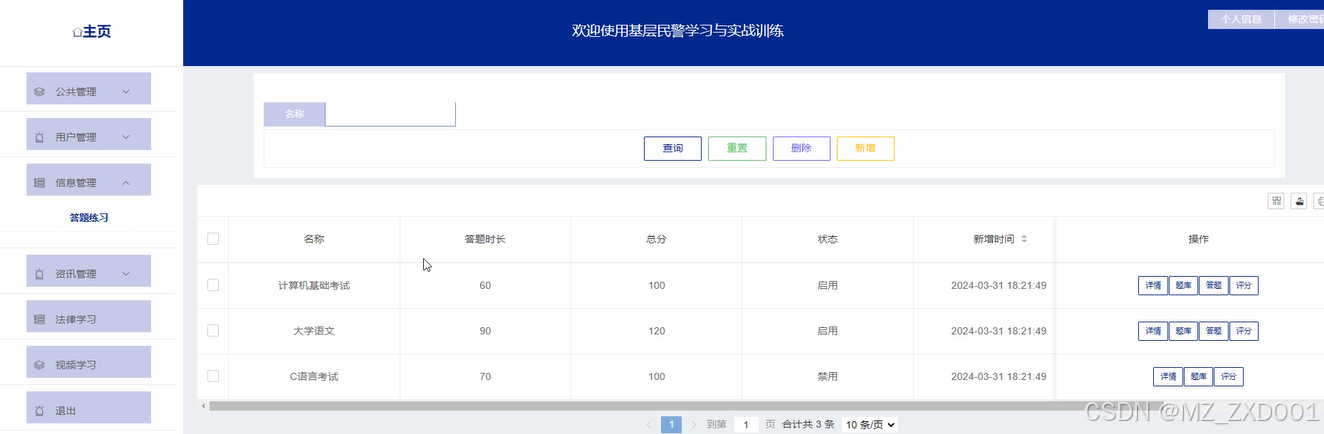 在当今社会,基层民警的工作任务日益繁重,需要不断提升专业知识和实战能力以应对各种复杂情况。然而,传统的学习和训练方式存在时间和空间限制,难以满足基层民警的需求。基于Django框架和HTML技术的学习与实战训练系统的设计与实现,旨在为基层民警提供便捷高效的学习平台和实战训练资源,促进其专业发展和能力提升。这一研究具有重要意义,不仅可以提高基层民警的工作效率和素质,还可以加强社会治安维护工作,推动警务工作的现代化发展和智能化提升。通过这一系统,基层民警将能够更好地适应复杂多变的工作环境,提升工作水平和应对能力,为社会和民众提供更加安全稳定的环境。