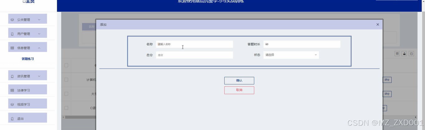 信息管理:用户点击可查看答题练习,可查看用户答题详情,同时进行评分操作;点击右侧“新增”按钮,输入名称、答题时长、总分,选择状态,点击“确认”按钮进行添加新的答题练习。点击“题库”后点击“新增”按钮,选择类型,输入题目名称、选项、参考答案、分时和排序,点击“确认”按钮进行添加新的题库。如下图所示。