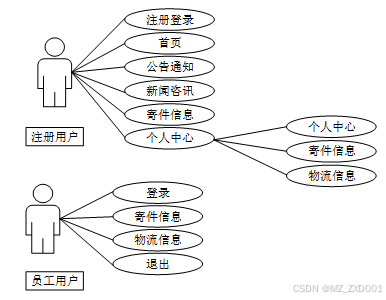 基于物联网的物流信息系统的功能主要分为注册用户、员工用户和管理员,用例图如下。