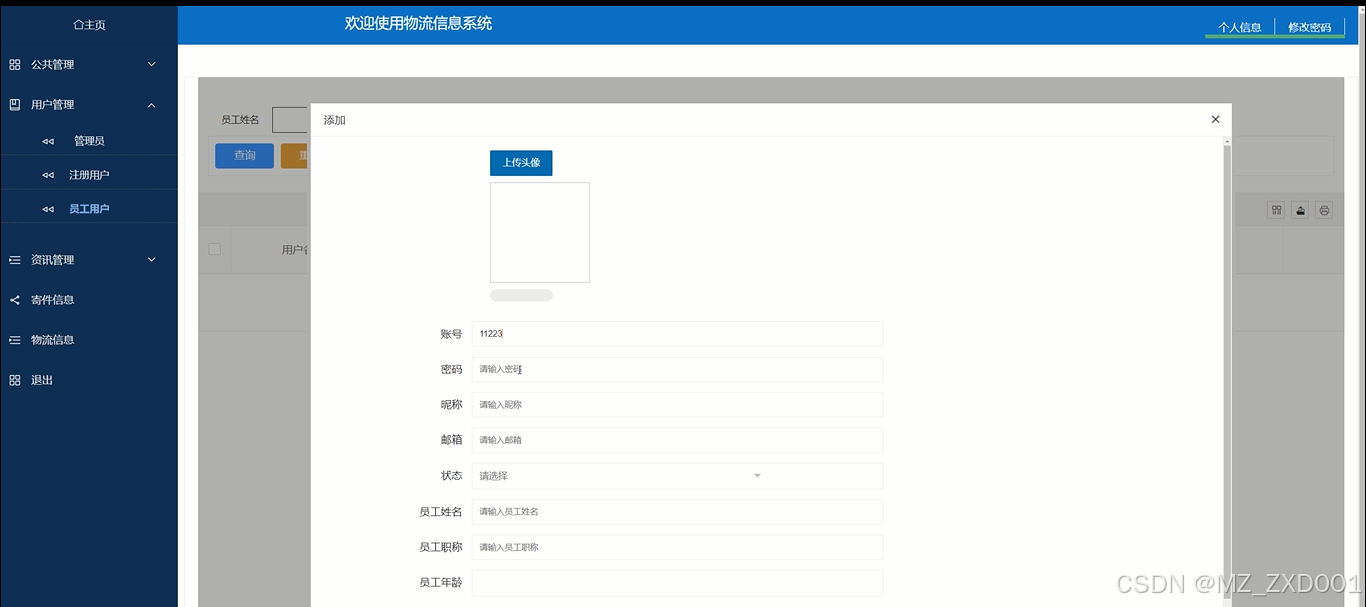 (3)用户管理:管理员点击可查看管理员、注册用户和员工用户;如需添加员工用户,点击右侧“添加”按钮,输入账号、密码、昵称、邮箱,选择状态,输入员工姓名、员工职称和员工年龄,点击“提交”按钮进行添加员工用户。
