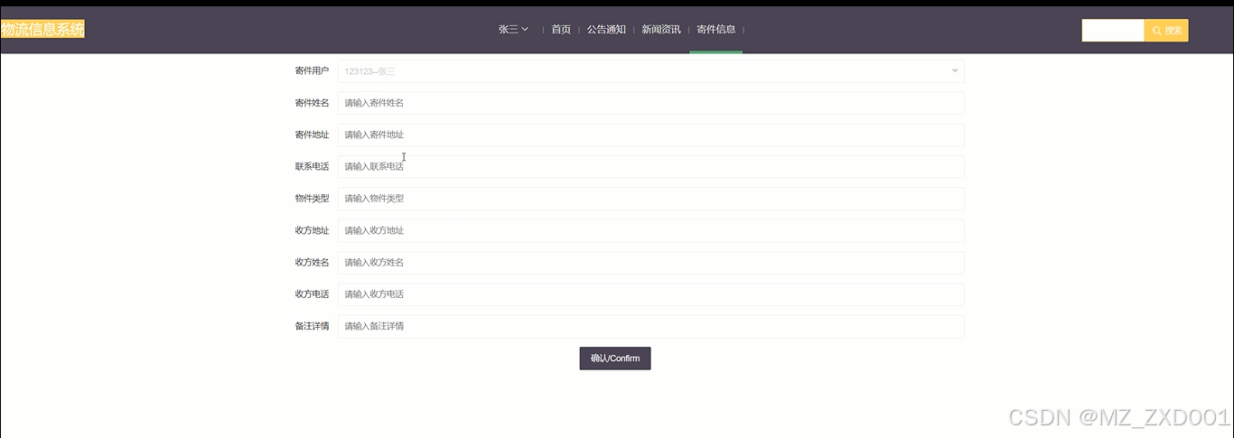 (5)寄件信息:用户点击可填写寄件信息,包括选择寄件用户,输入寄件姓名、寄件地址、联系电话、物件类型、收方地址、收方姓名、收方电话和备注详情。