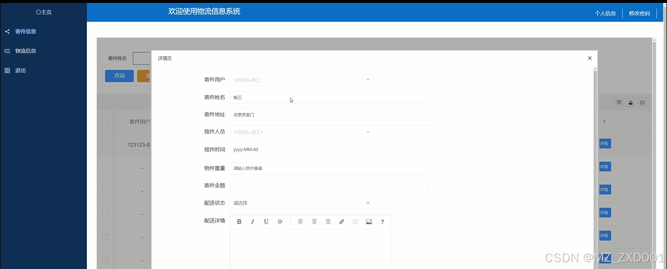 寄件信息:员工用户点击可查看加减信息以列表,点击“揽件”按钮可填写揽件信息,包括揽件人员、揽件时间、物件重量、寄件金额、配送状态和配送详情。界面如下图所示。