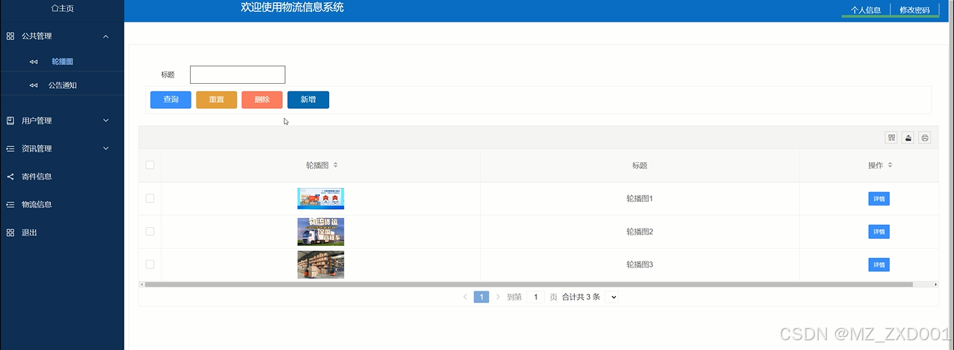 (2)公共管理:管理员点击可查看轮播图和公告通知;点击轮播图右侧“新增”按钮,上传轮播图图片和输入标题,点击“确认”按钮进行添加轮播图;点击公告通知右侧“新增”按钮,输入标题和正文,点击“确认”按钮进行添加新的公告通知;同时可对轮播图和公告通知进行增删改查 。